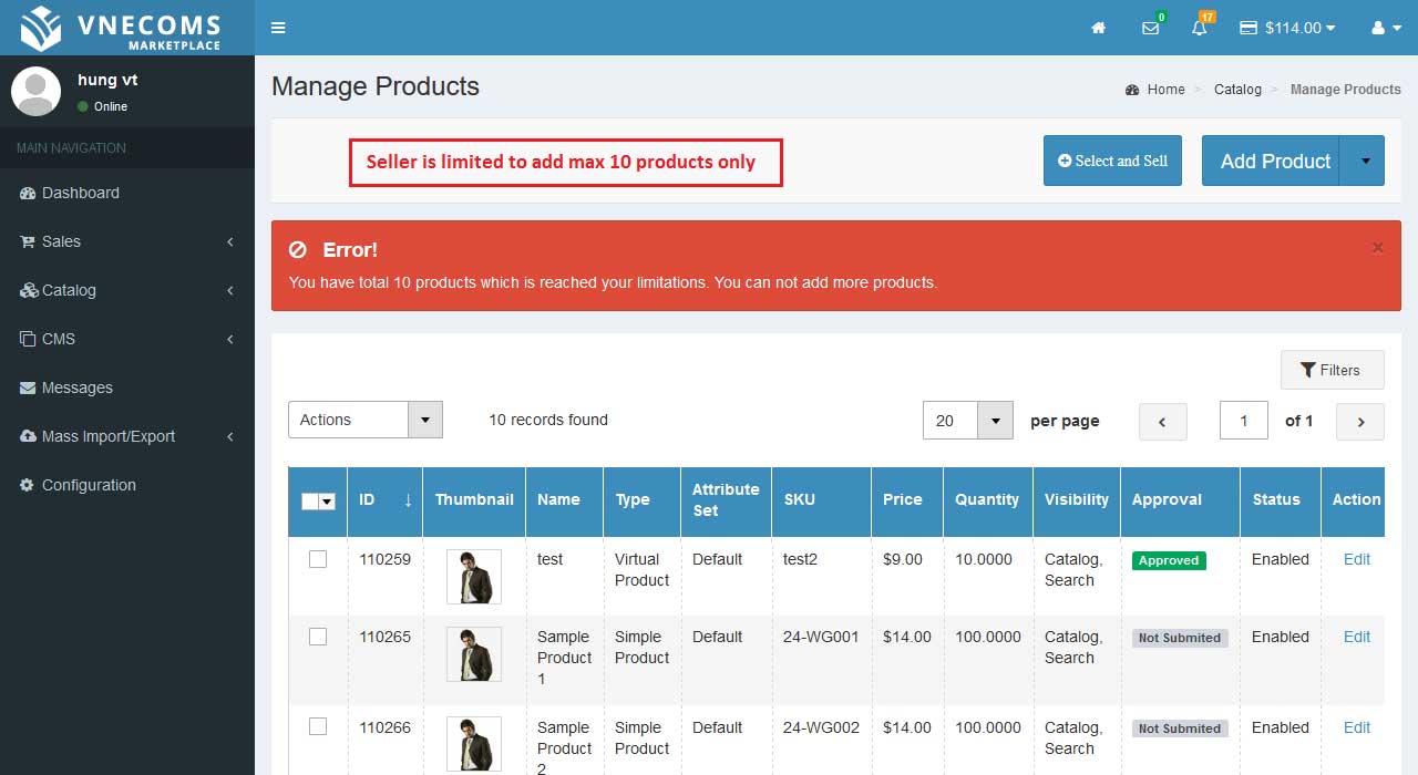 From the seller dashboard, sellers will have an overview of their store. The seller will able to see the credit amount, total sales, last 5 orders, last 5 transactions, most viewed products, best sellers, ...